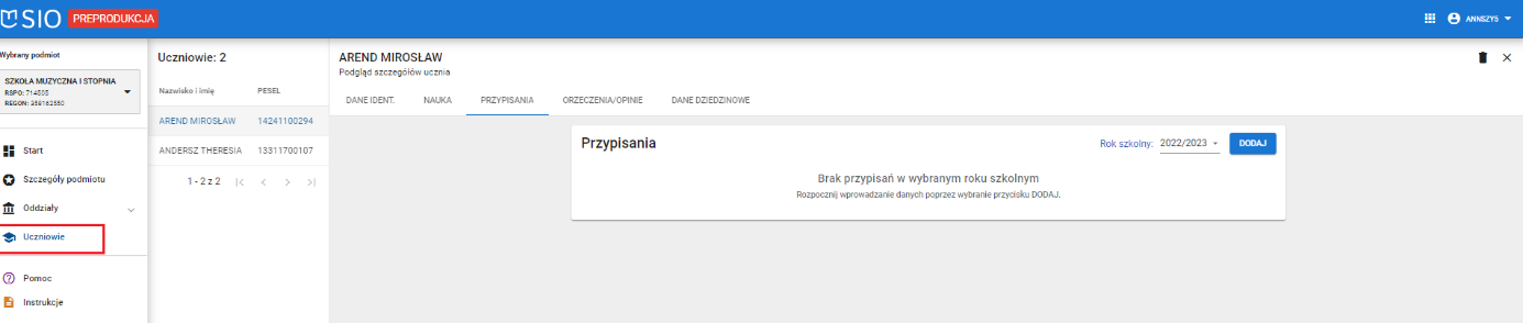 Ucznia można przypisać do oddziału – po wejściu w zakładkę UCZNIOWIE.